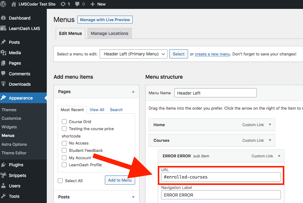 - Label: Courses. URL: Whatever. Could be # or your course archive page.