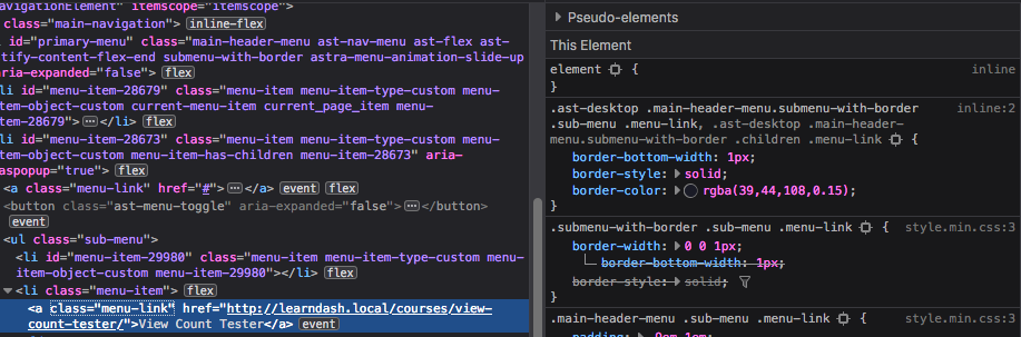 Inspecting submenu links in Astra. You want to make sure you copy the CSS classes styled.