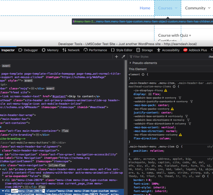 With this snippet, we could traverse up from that #enrolled-courses link again. Although since you may need to inspect to find the appropriate “parent menu item” selector anyway, I figured it would be easier to just select the menu item ID directly.