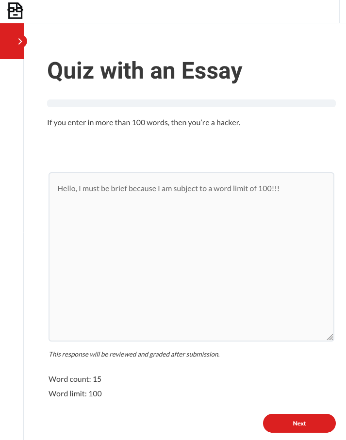 The finished product: a LearnDash essay question with word count limitations.
