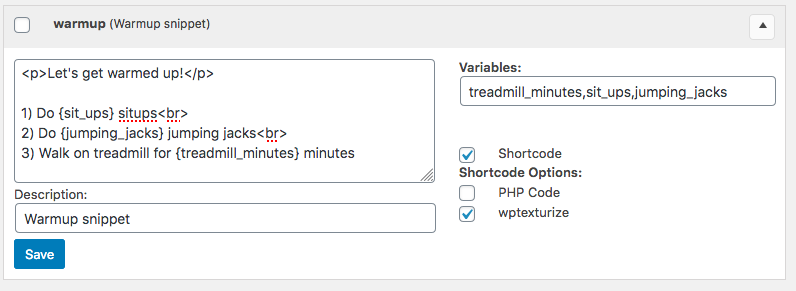 • The Name will serve as the shortcode name. In this case, [warmup ...], so be sure the shortcode name does not conflict with other shortcode names in use on your site.
