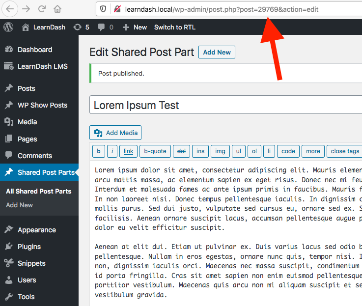 Published “Shared Post Part” with ID pointed out